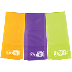 IThe GoFit Latex Free Flat Band Kit consists of 3 flat bands and training manual. Durable, latex-free bands for versatile and effective resistance training to tone and shape your entire body. Perfect for rehab; ideal for pre-game or pre-activity warm up, and stretching. Resistance Rating: Light (Gold - 5lb), Medium (Purple - 10lb), Heavy (Green - 15lb). Length: 4ft (≈1.22m) Width: 6in (≈15cm)