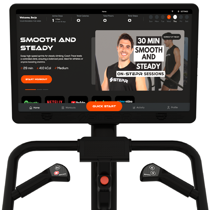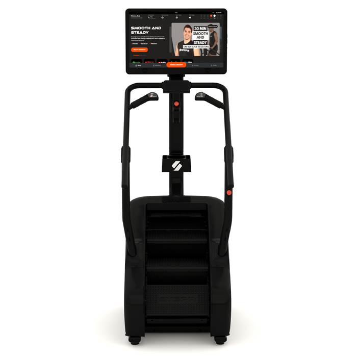 The STEPR+ is a cutting-edge stair climber, offering an intense yet low-impact workout with speeds reaching up to 140 steps per minute. Its sleek, compact design allows it to fit seamlessly into any room of the home. Equipped with a 27" HD touchscreen, you can stream your favorite apps, take scenic routes, or access on-demand classes instantly—all without a subscription.
